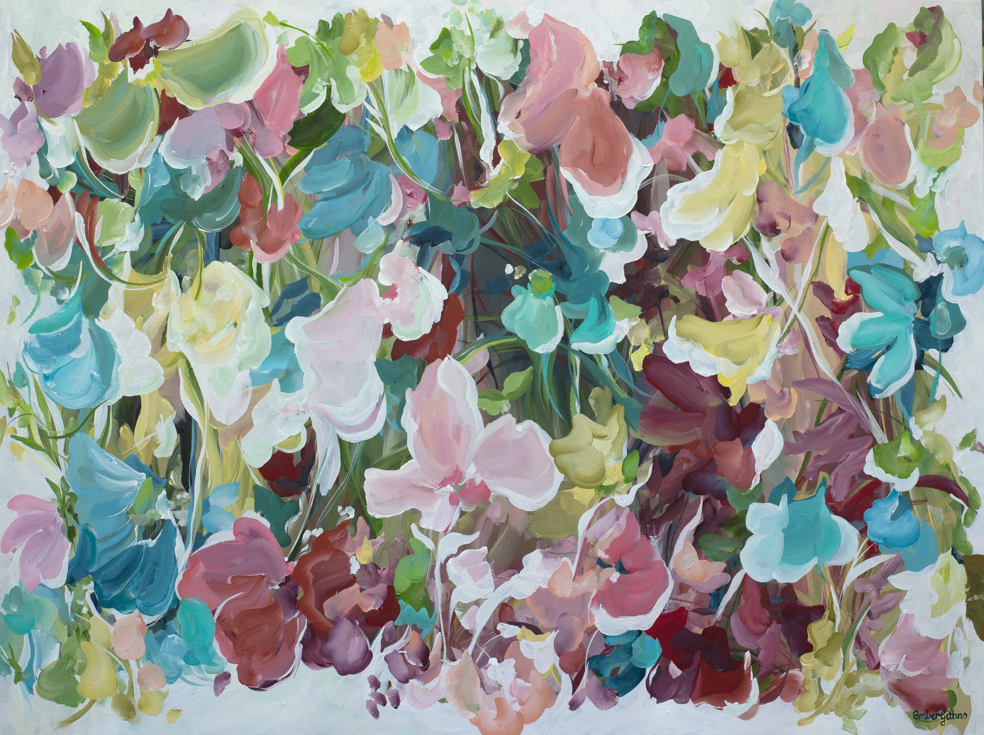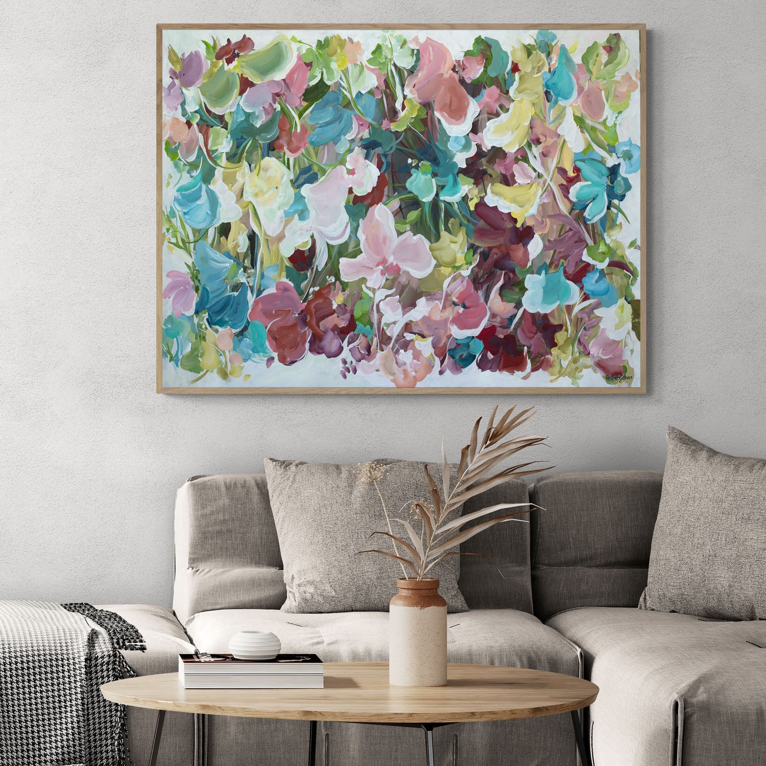 A gorgeous colourful flower inspired piece of original art that showcases the wonderful blooms and colours within our gardens. This stunning floral abstract original painting will elevate your room with a modern organic style and eye catching colour palette of pinks, blues, aquas, pale yellows and natures greens. A refreshing colourful palette that will lift and bring joy into your room.