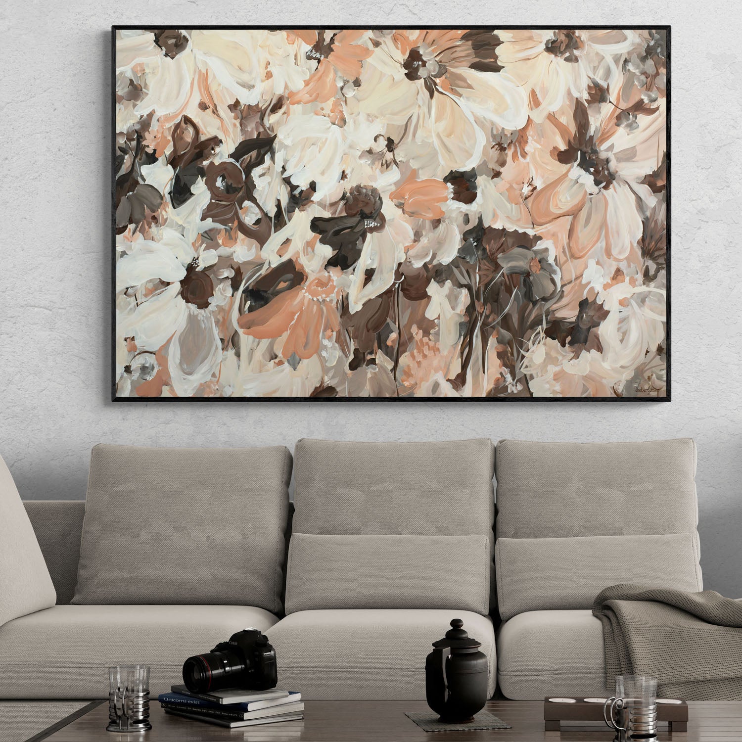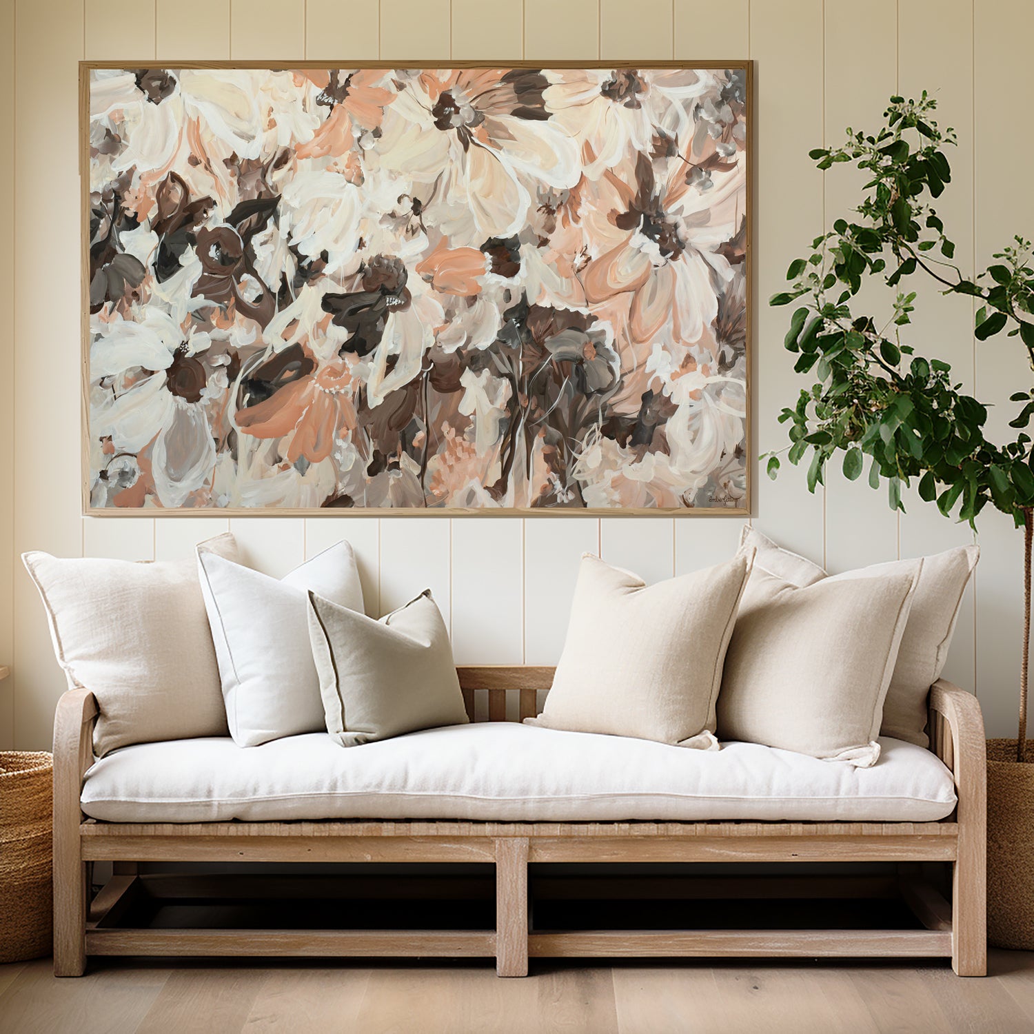 With a minimal, natural chocolate brown, light beige and apricot, pastel orange colour palette that will never go out of style. Unique abstract flowing brushstrokes to create movement and tranquility in your neutral home styling. Bringing the calming and joyful elements of nature and wellness into your room. A great addition to a contemporary natural interior styled room that has a large wall to fill.