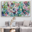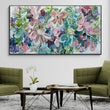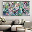 Extra large abstract art for a modern home interior feel. Elevate your interior and experience the breathtaking beauty of nature within your home. An abundance of heartwarming colours bringing warmth and tranquility onto your walls. A modern colour palette of natures greens, soft teals, pale yellows, warm pinks and lilac purples, such a beautiful colour combination that will elevate your rooms ambience.