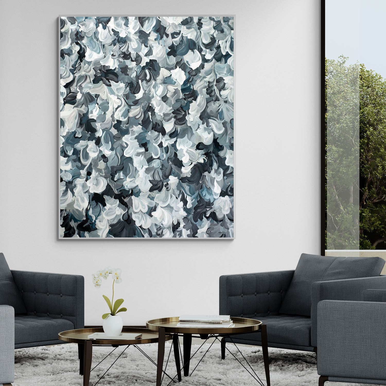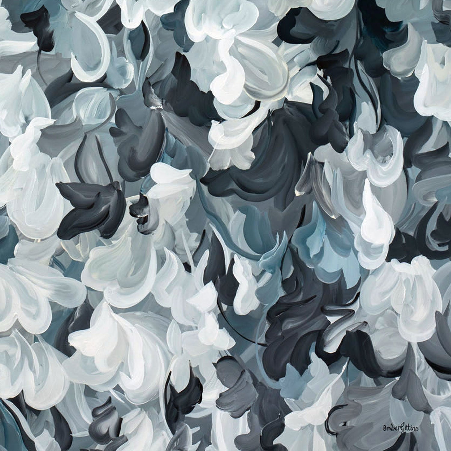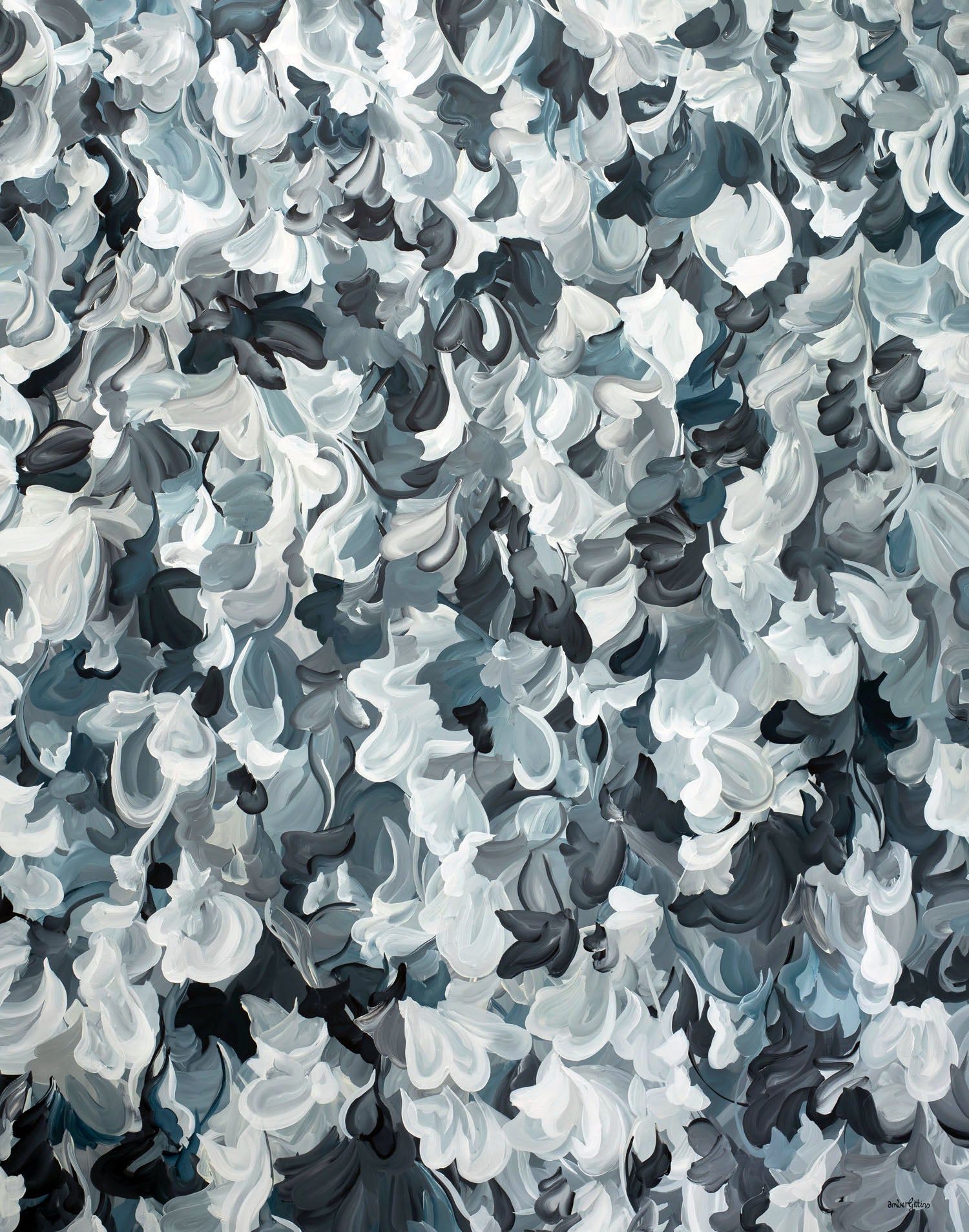 Capturing Midnight is an immersive abstract painting that evokes the quiet intensity of night in motion. Layered, gestural brushstrokes ripple across the surface in a sophisticated palette of soft whites, silvers, charcoal and deep blue-greys, creating a sense of depth and constant movement. The composition feels both atmospheric and intimate - like moonlight breaking through drifting clouds or shadows folding into one another after dark.