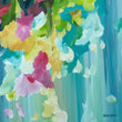 Petals tumble from above in a rush of crimson, blush, lemon and turquoise, flowing over a luminous veil of aqua and sea-glass blues. The vertical movement of the background creates the sensation of rain or falling water, while the blooms burst forward in confident, expressive strokes. It feels spontaneous, like standing beneath a shower of blossoms carried on a warm breeze.