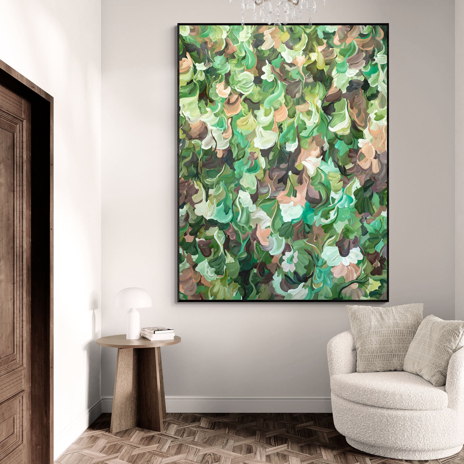 Bring nature into your home with this stunning extra large abstract original painting. Inspired by the tranquil elements in nature. Elevate your room with a modern style in calming natural green, warm browns and light apricot shades that will never go out of style.