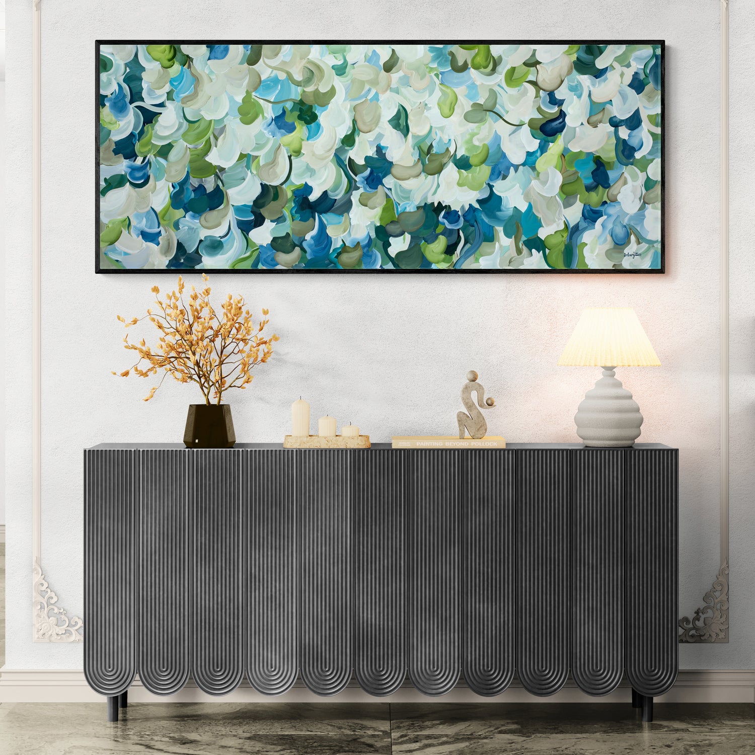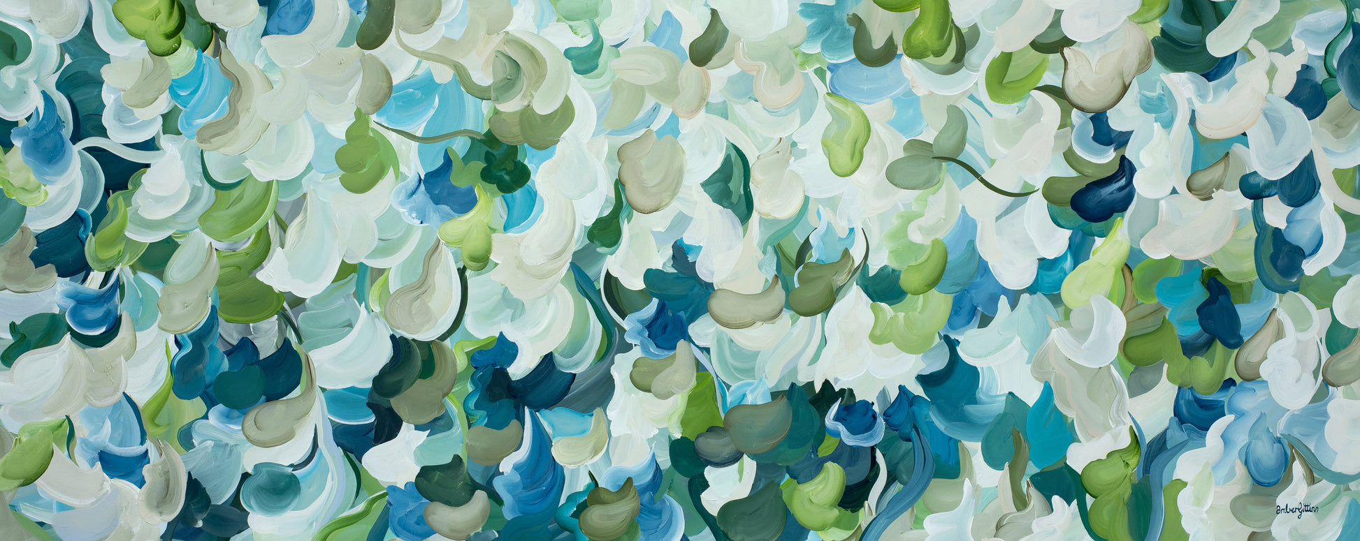 Ocean View captures the ever-changing rhythm of water and light - those moments when the horizon blurs and the mind begins to wander. Layers of soft blues, seafoam greens and gentle whites sweep across the canvas, evoking waves folding into one another, sunlight dancing on the surface, and the quiet breath of the ocean as it moves without pause.