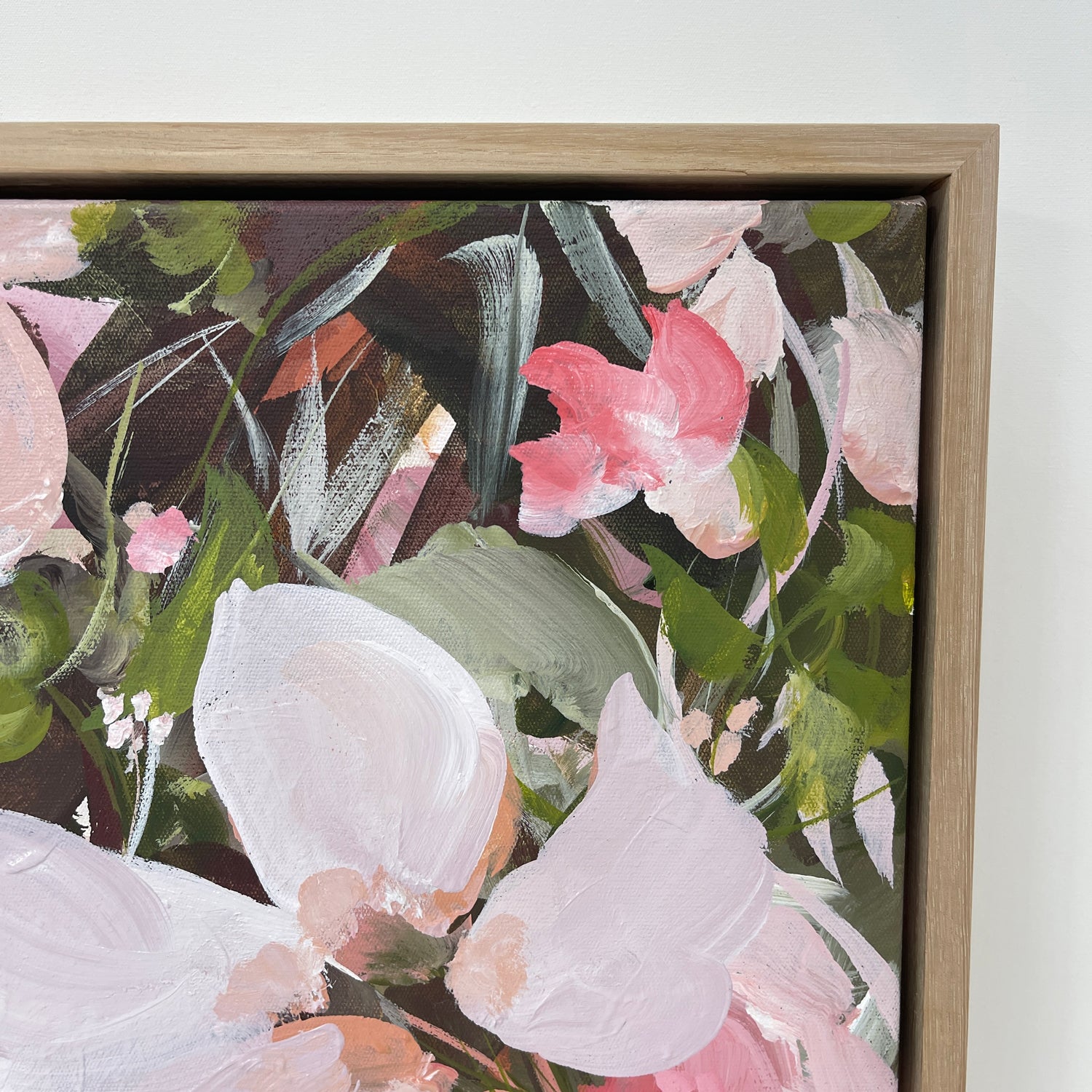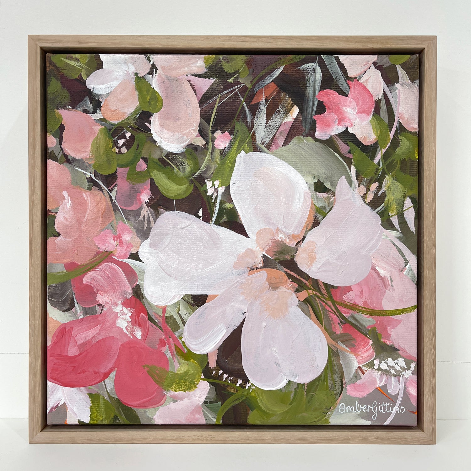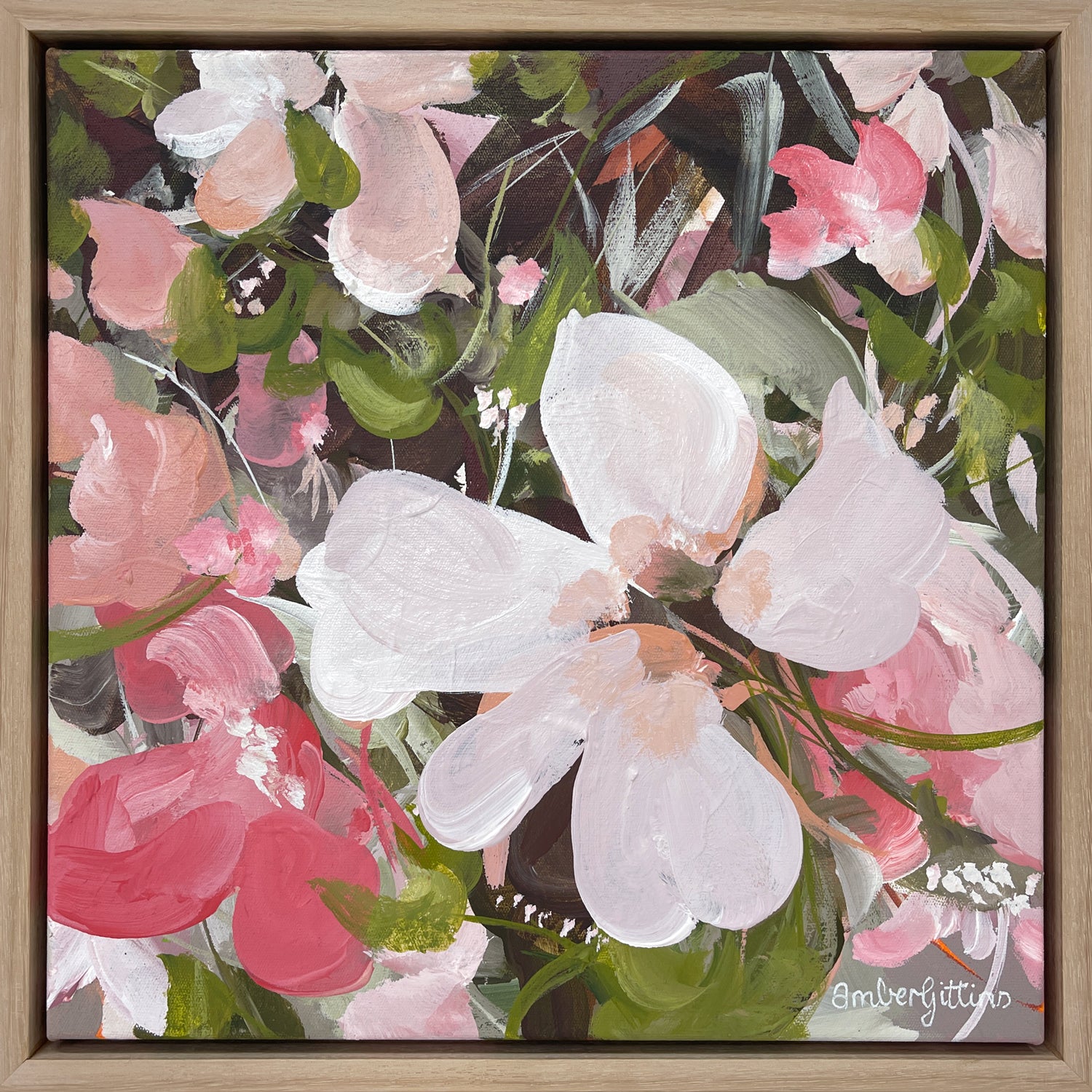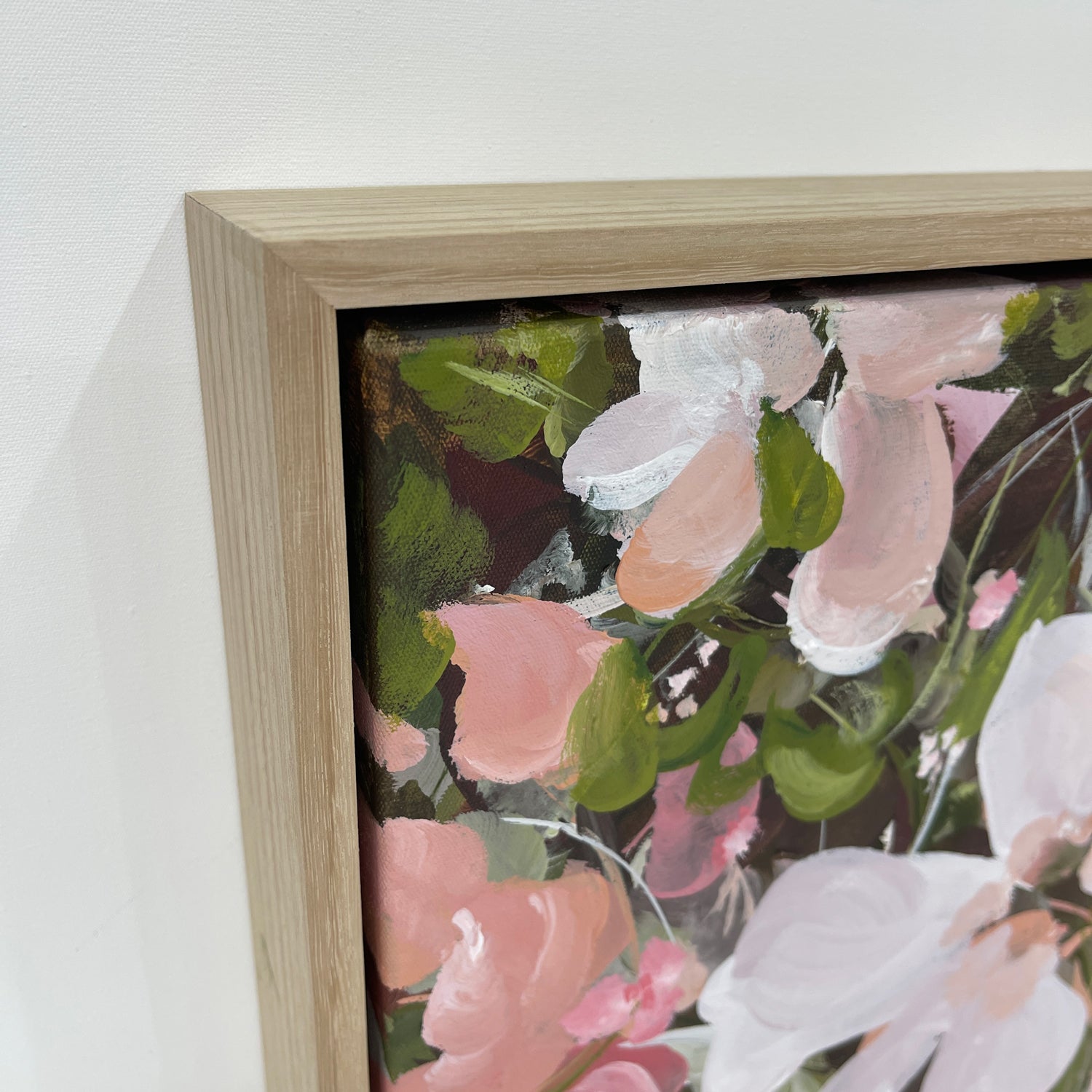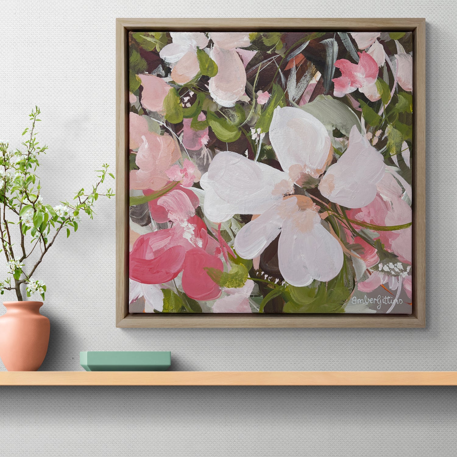 Bring nature into your home with this stunning abstract floral original painting. Inspired by the tranquil moments wandering in nature and admiring all the blossoming flowers. Elevate your room with a modern botanical style painting in calming natural greens and soft warm pinks that will never go out of style.
