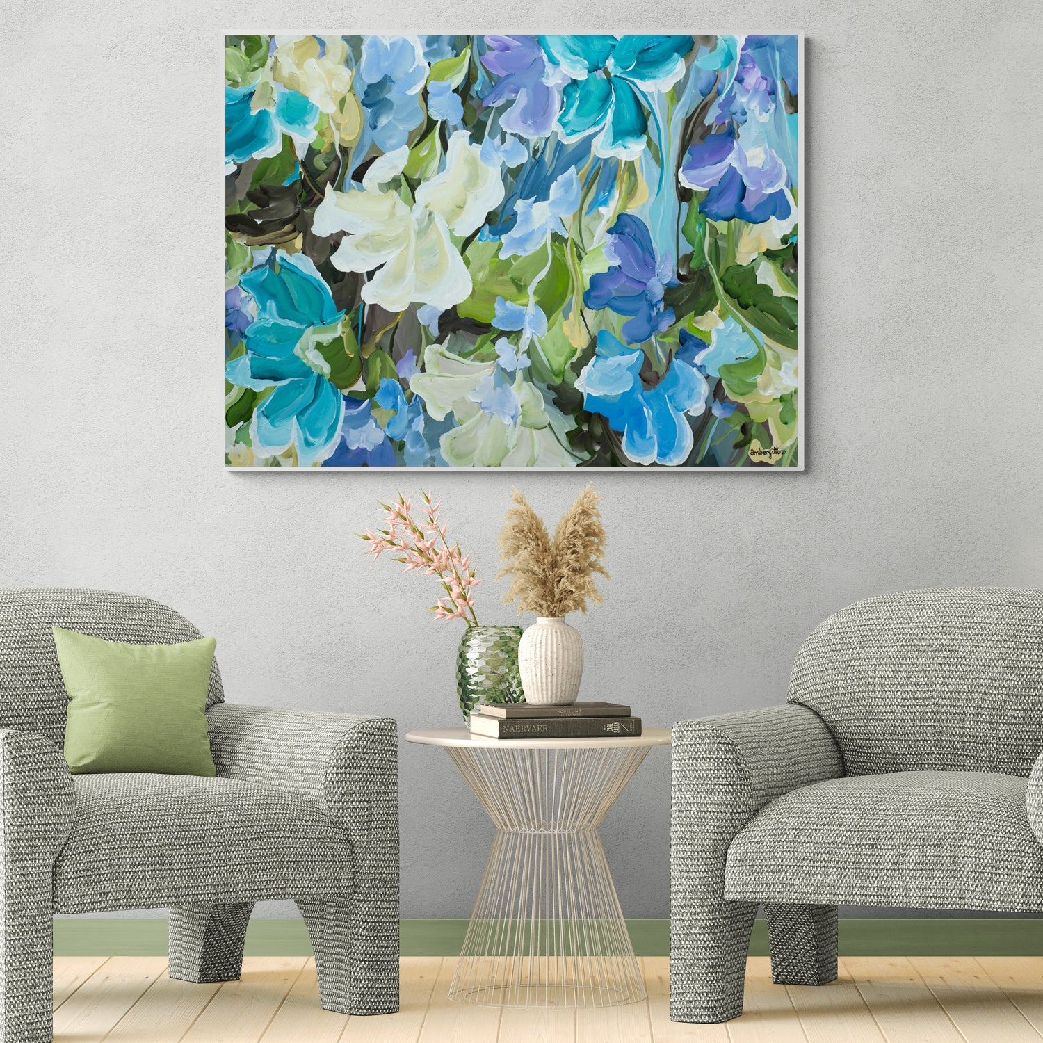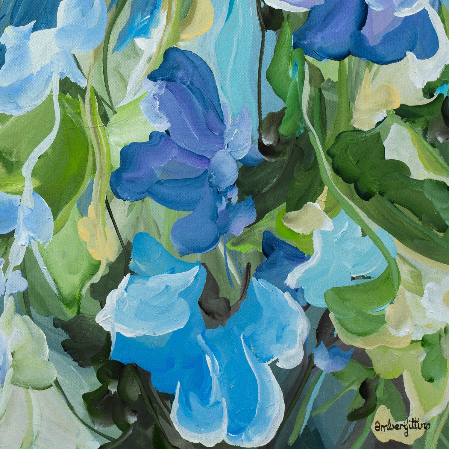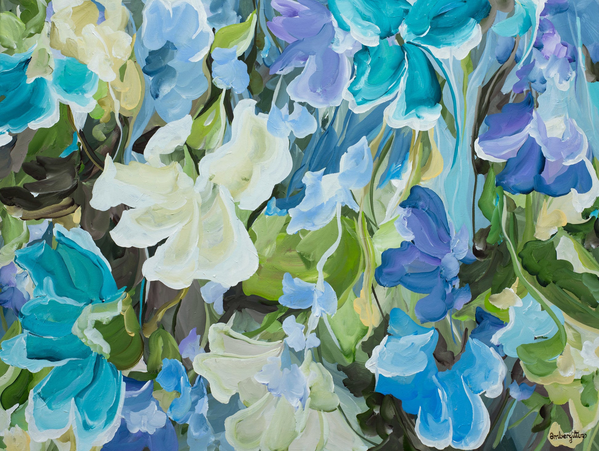 Quiet Moments is a gentle exhale in paint - a soft symphony of blues, teals and fresh greens that feels like standing in a cool garden just after rain.