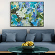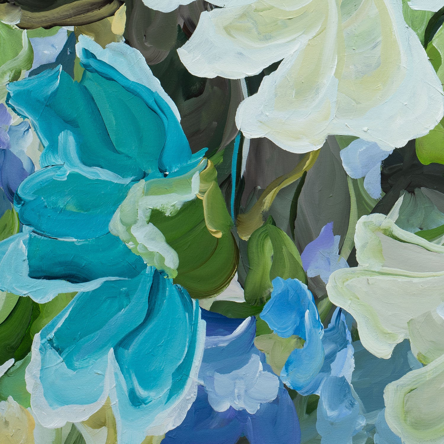 Layers of delicate petals drift and fold into one another, creating movement that is both fluid and soothing. Creamy whites glow against tranquil turquoise, while hints of lavender and sky blue weave through the composition like light filtering through leaves. The brushstrokes are confident yet tender, giving the blooms a sense of life - as though they are swaying quietly in a private breeze.