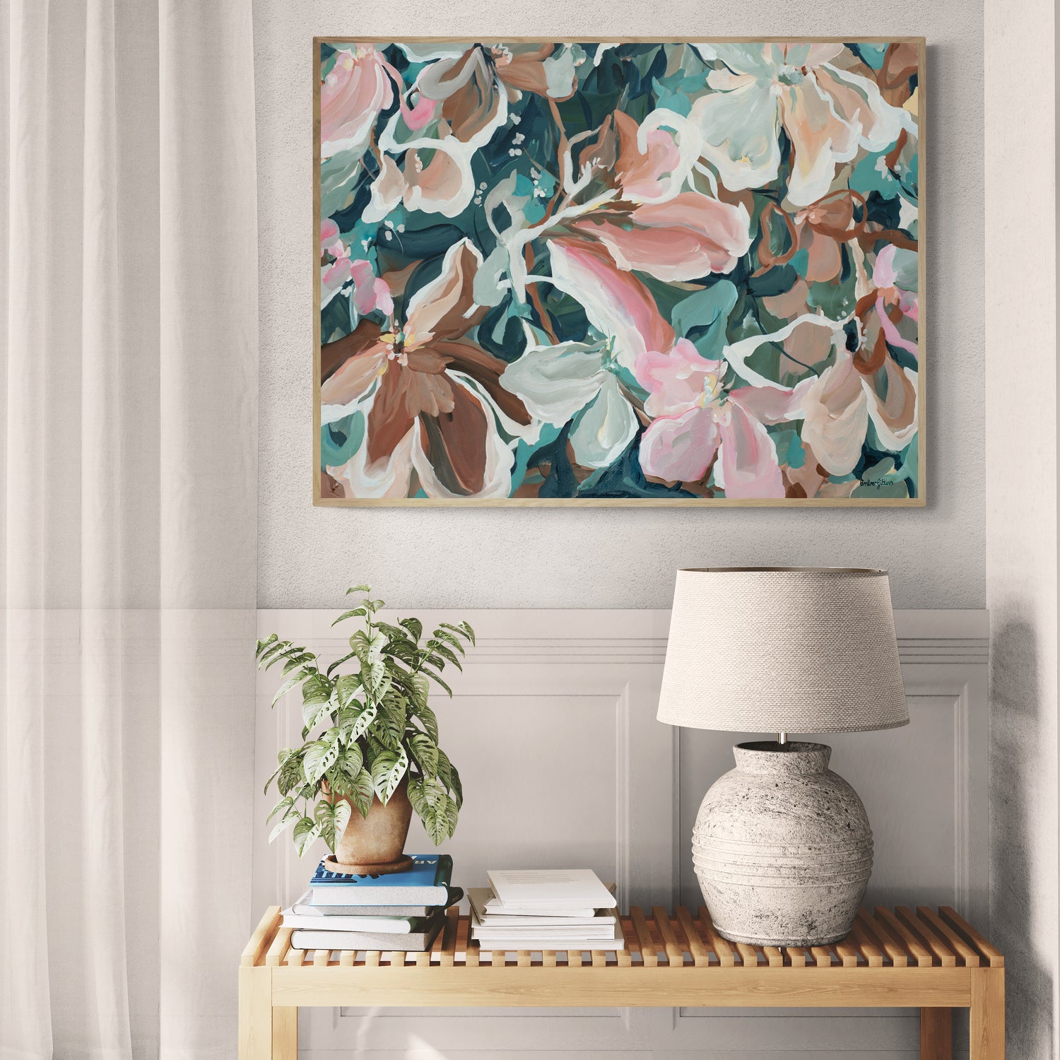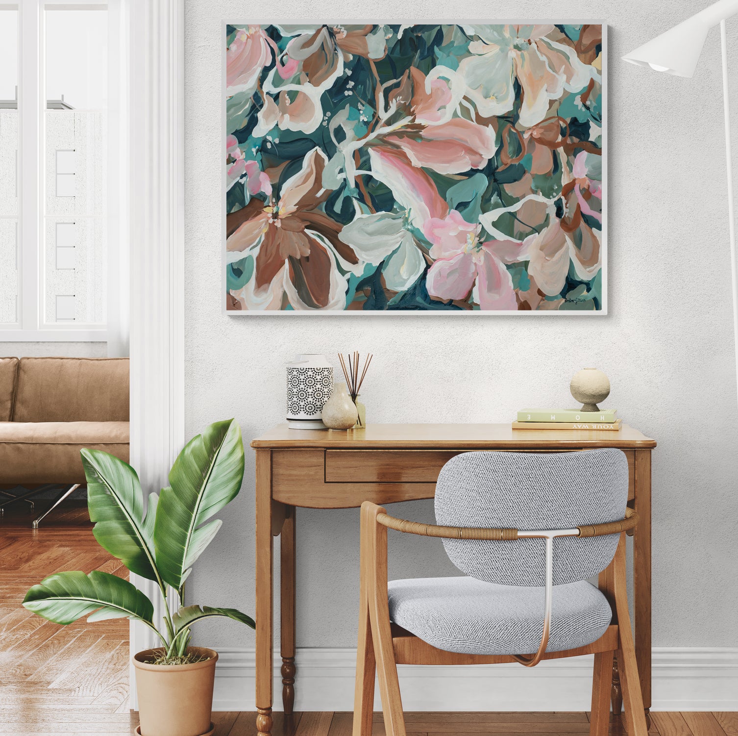 Modern, fun, elegant and freedom are what come to mind with this gorgeous original painting. A fun and energetic floral abstract art that will make an eye catching statement in your room. Elevating your room with a modern organic style and soft and romantic colour palette of 'very now' sage green, soft pinks and warm browns. A refreshing colourful palette that will lift and bring joy into your room.