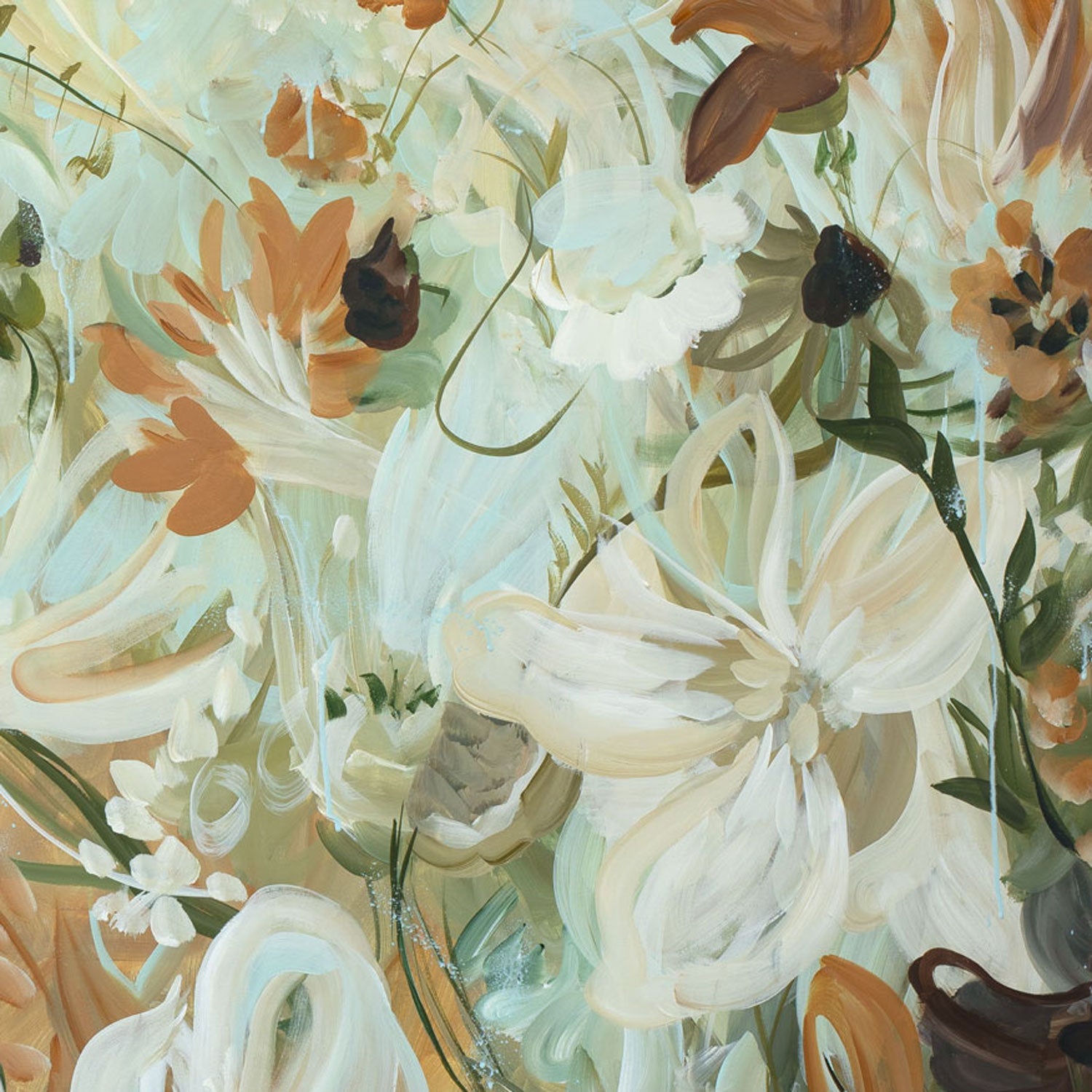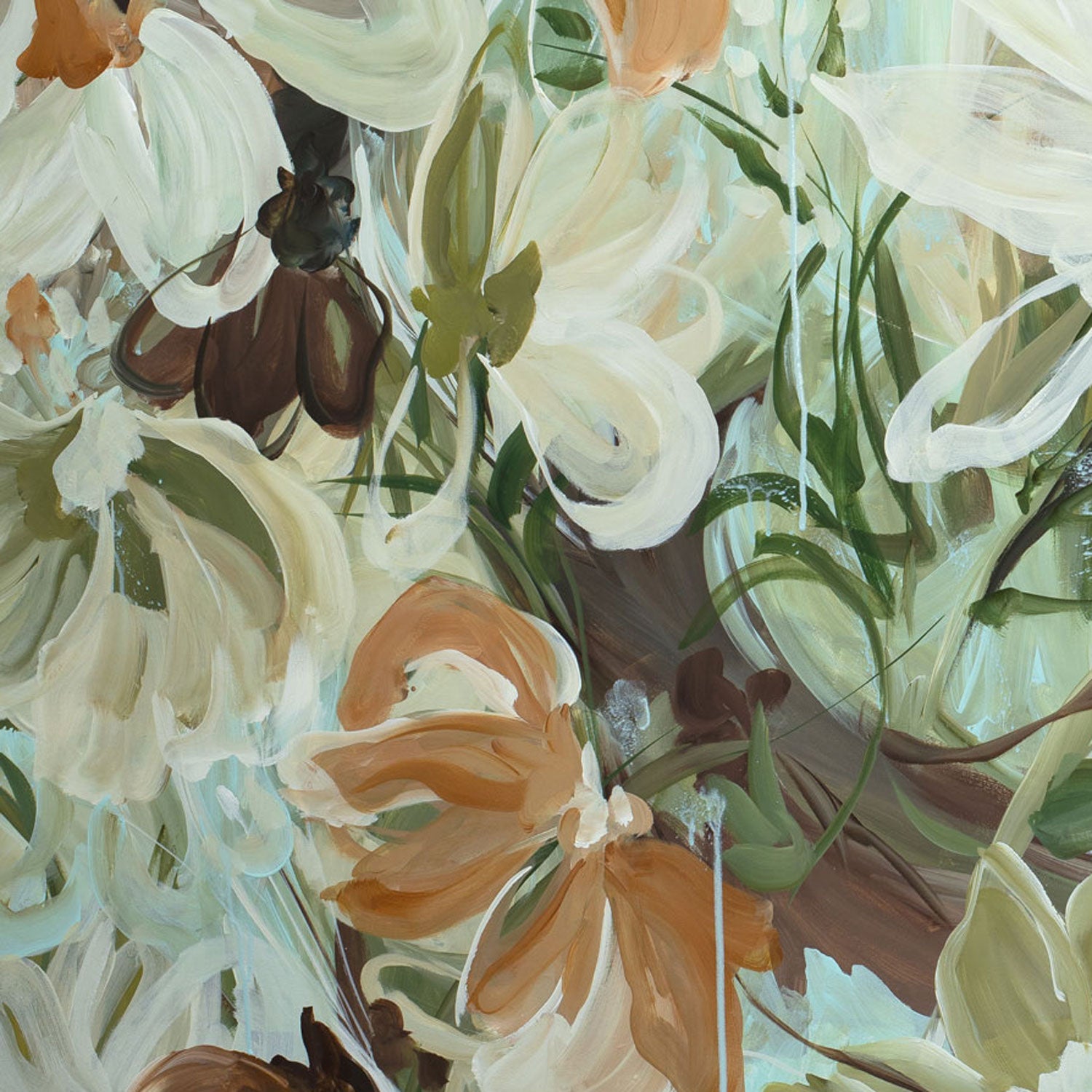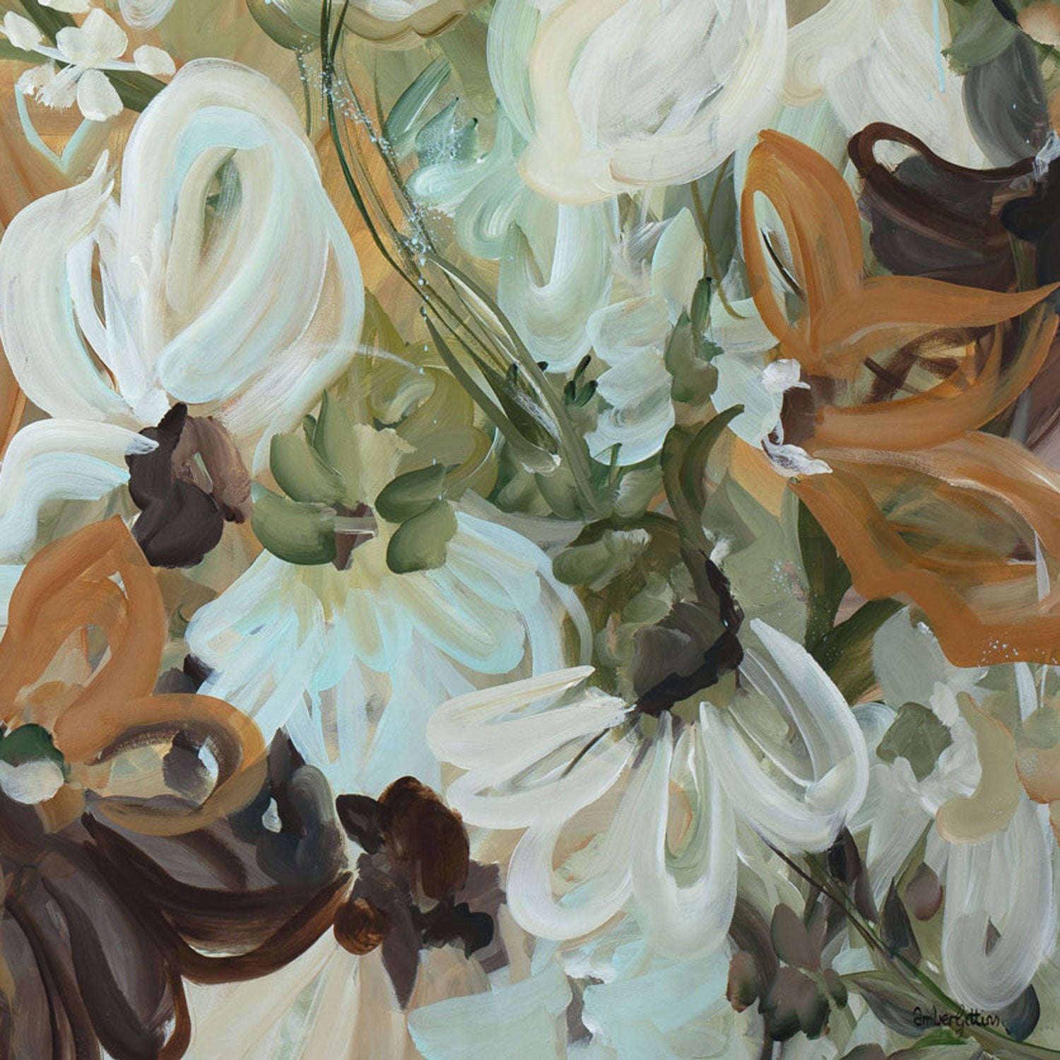 Untamed Calm is a soft, airy expression of nature in motion - where delicate petals seem to drift effortlessly across the canvas like a gentle wind passing through a sunlit garden. Layers of creamy whites, muted greens, warm earth tones and subtle hints of sky blue create a palette that feels both calming and quietly uplifting.